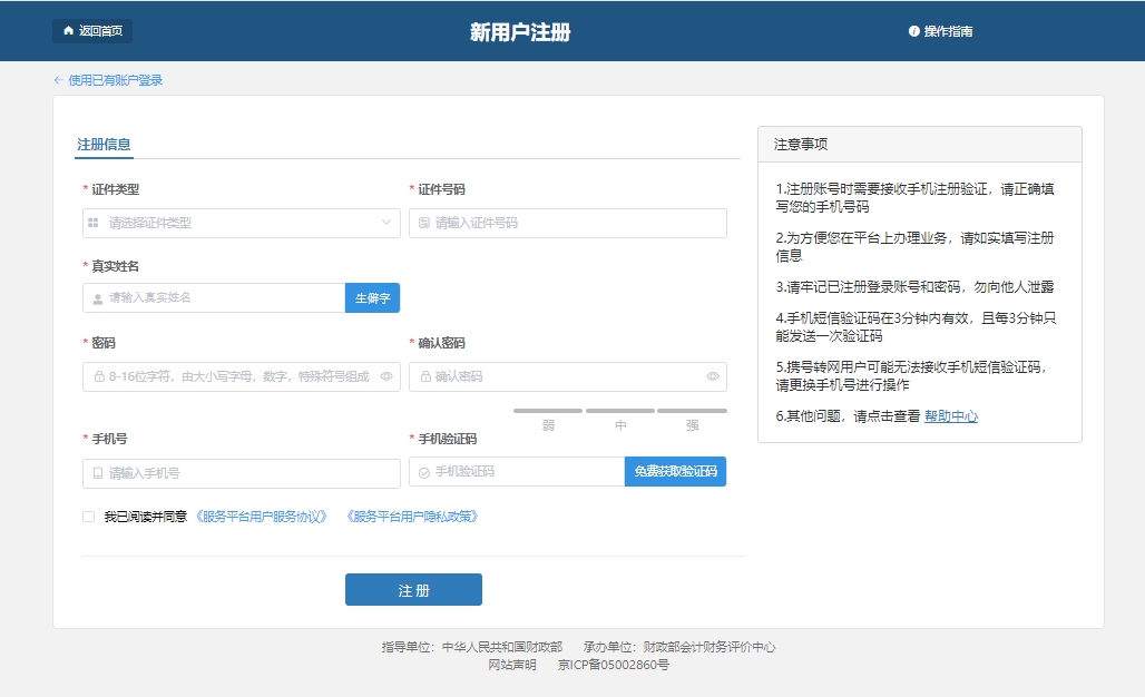 全国会计人员统一服务管理平台网址为:https://ausm.mof.gov.cn/index点击右上角“注册”按钮,进入到注册操作页面。